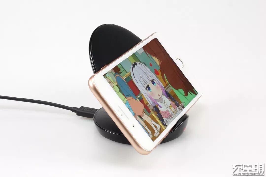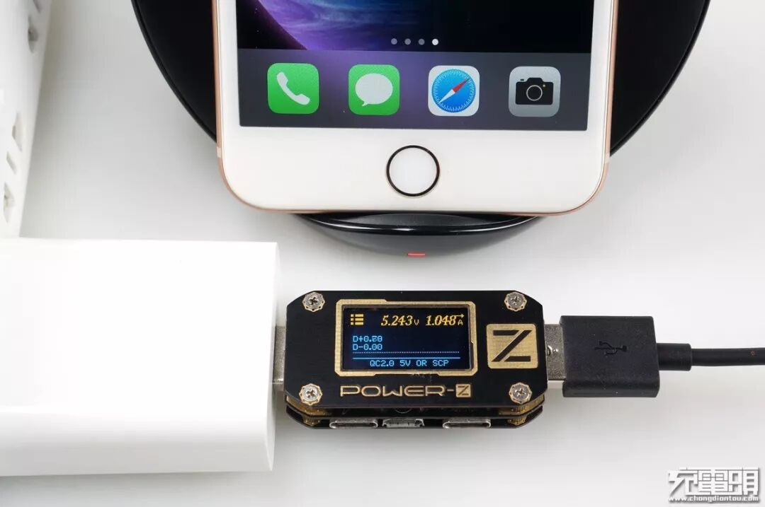 使用ChargerLAB出品的POWER-Z KM001便携式USB PD测试仪测试,发现这款无线充电器支持iPhone 8 Plus普通5W充电,不支持iPhone 7.5W无线快充。