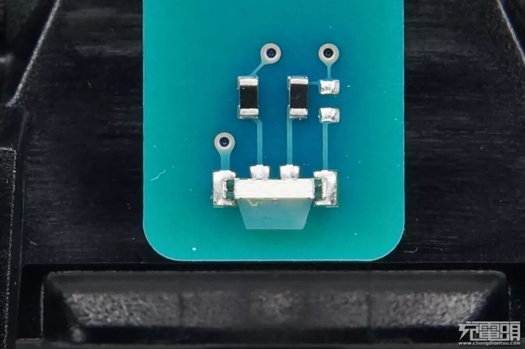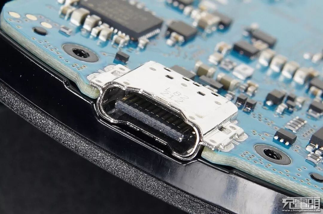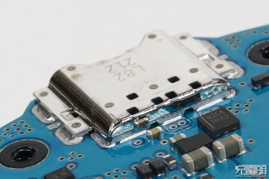在这个位置可以看到,沉板USB-C母座外点焊了一个屏蔽罩,大范围焊接过孔焊接,十分耐操。