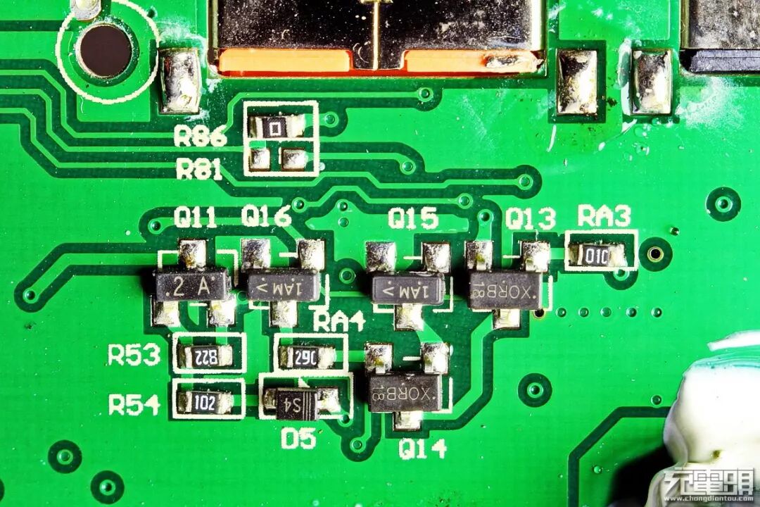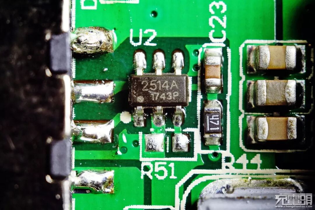 绝大部分原件均分布在PCB正面,下面我们来看下正面的主要功能IC: 黑色USB-A 2.4A智能输出接口附件的U2,来自于德州仪器的TPS 2514 A USB 识别芯片。