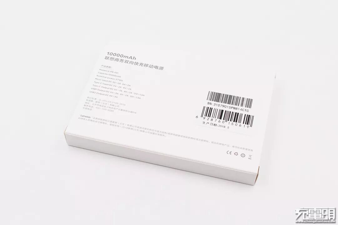 背面印有产品相关参数:名称:联想商务双向快充移动电源;型号:LS-PB-001;容量:10000mAh;额定功率:37Wh;Micro口输入:5V/2A、9V/2A;Type-C口输入:5V/2A、9V/2A;Type-C输出:5V/3A、9V/2A、12V/1.5A;USB1口输出:5V/3A、9V/2A、12V/1.5A;USB2口输出:5V/3A。