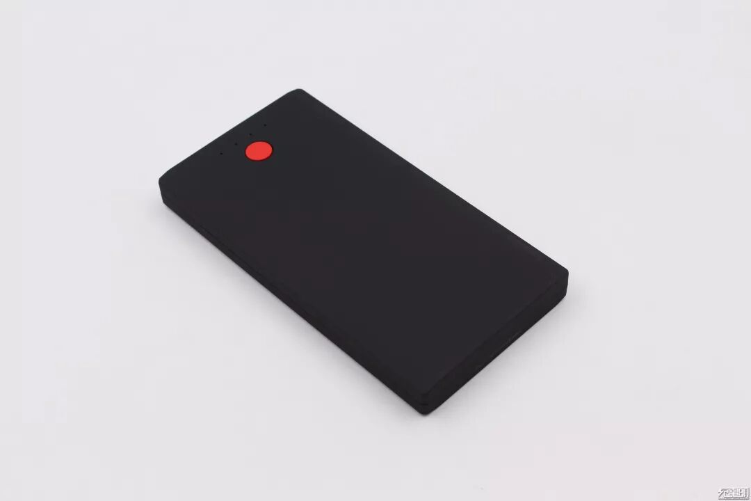 移动电源为哑光黑色,类肤手感,正面印有联想Logo,有一颗电源触发键,触发键为红色,典型的ThinkPad“小红点”元素。