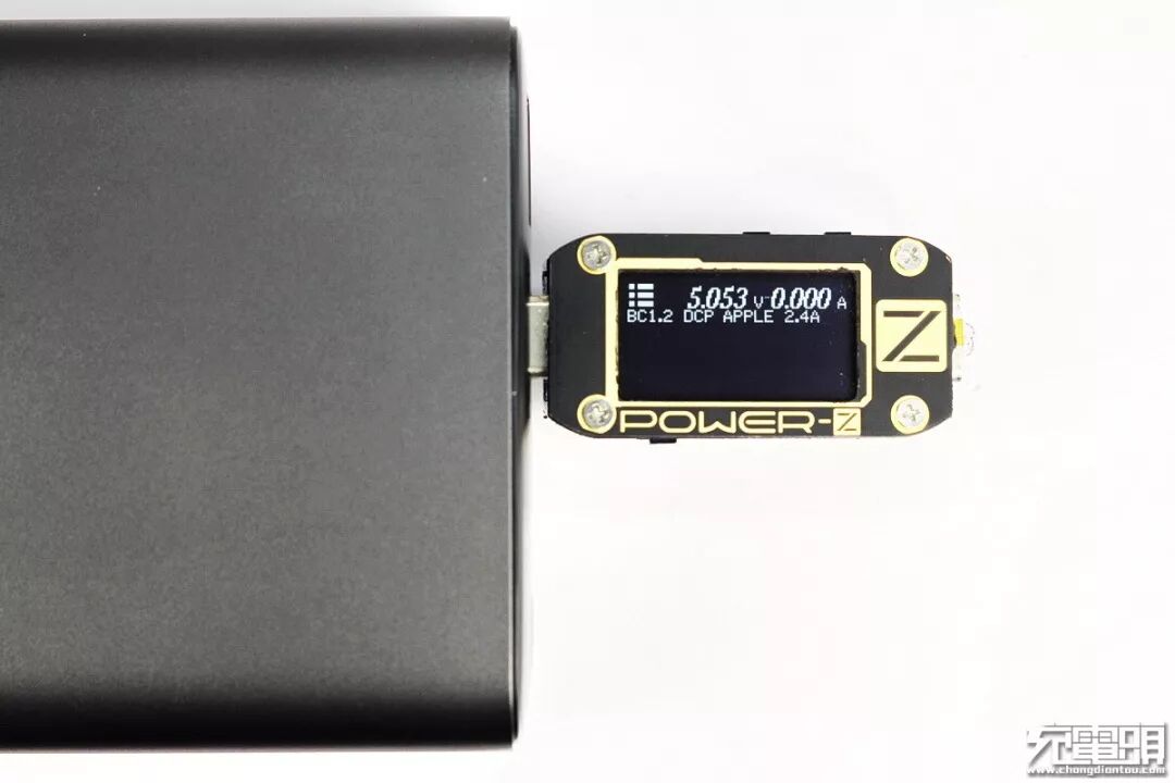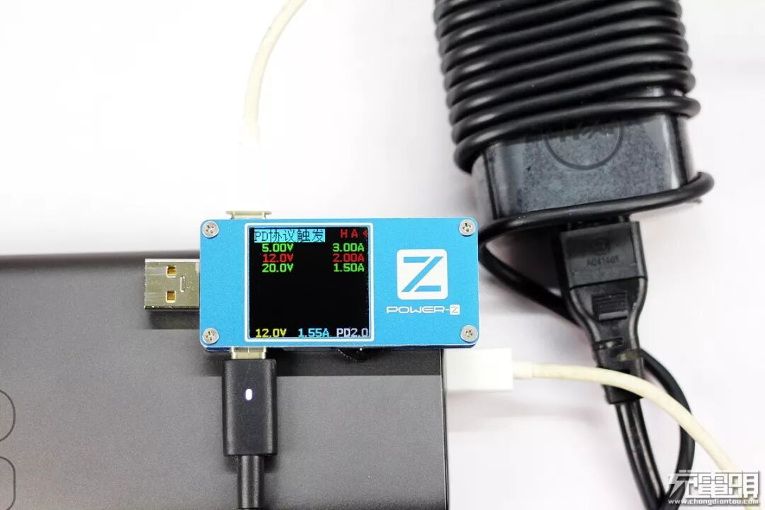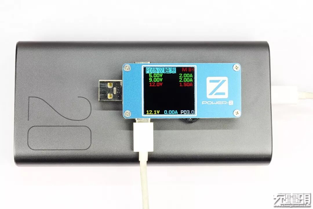 换成POWER-Z FL001 SUPER USB测试仪显示使用了电芯手机PD2.0规范,充电电压12.0V,电流1.55A,(功率≈18.6W)。