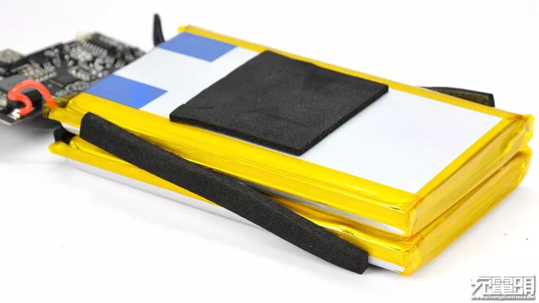 2块聚合物电芯并联,四周包裹减震泡棉保护电池。