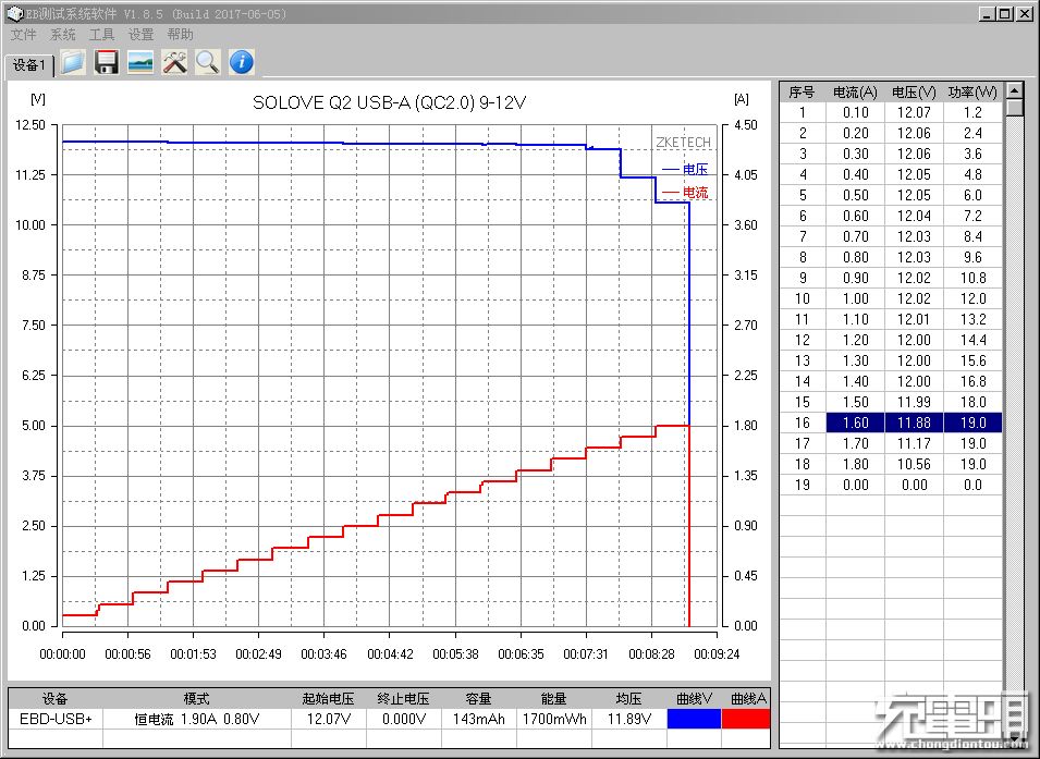 12V档最高支持到1.6A的输出能力,超过标称值,最大功率达到了19W。
