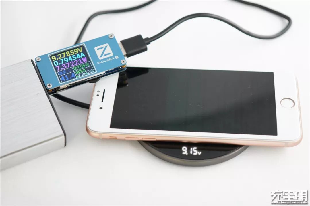 放上iPhone 8 Plus,使用ChargerLab POWER-Z FL001 Super测得无线充电器输入功率7.4W(9.28V0.79A),无线充电器下方数显屏上标示输出电压9.15V。