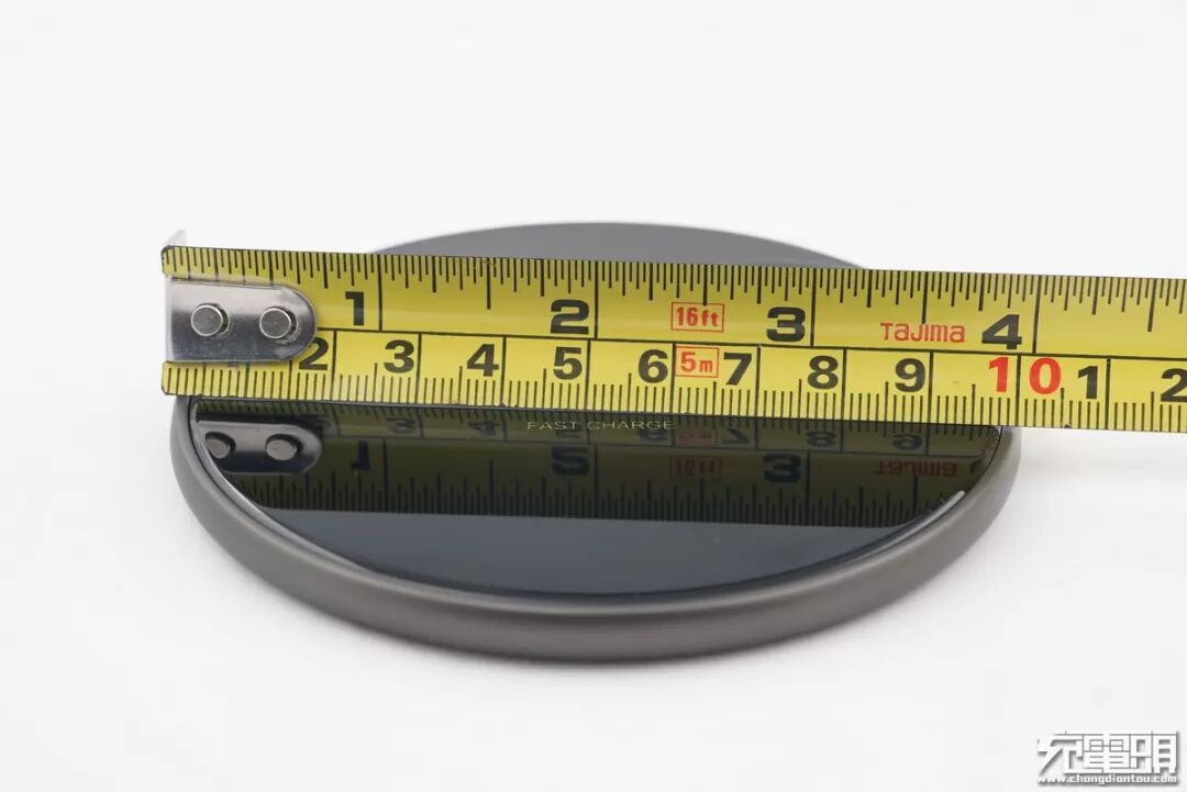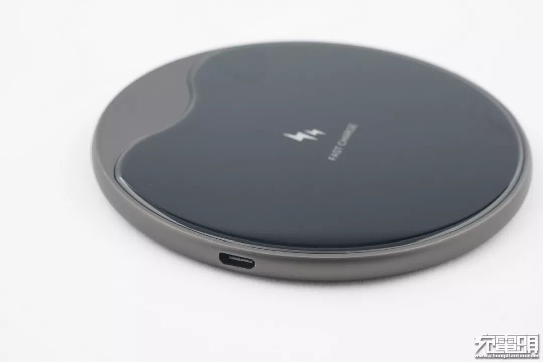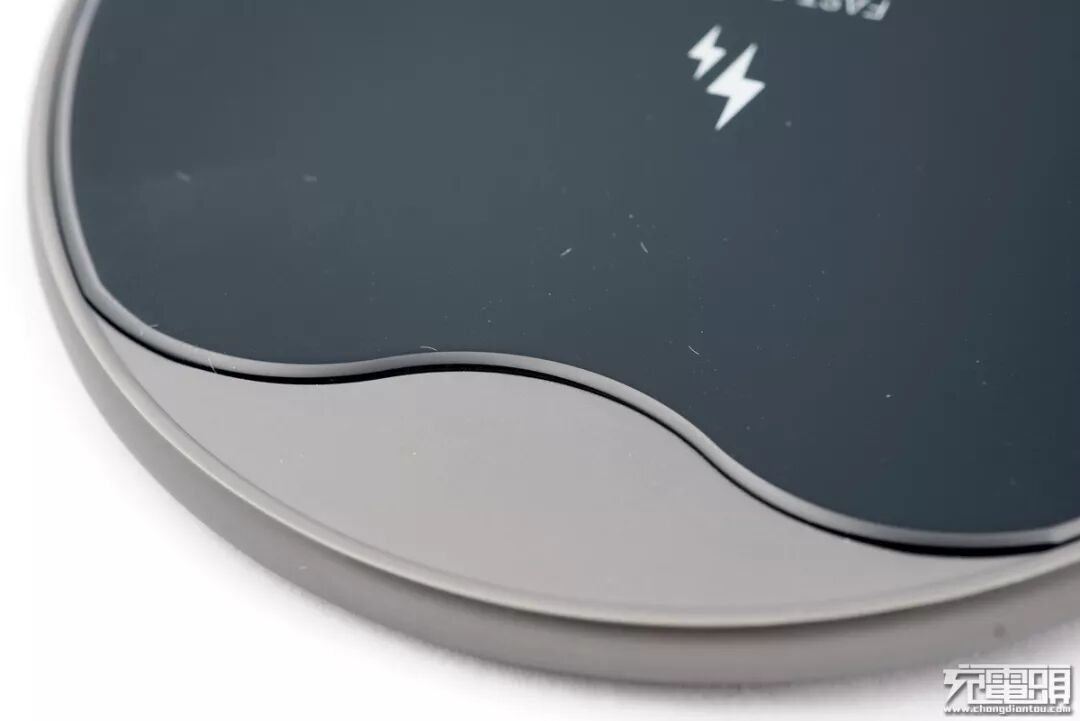 无线充圆形主体为棕色,心形面板为黑色,采用了超薄的造型设计。正中间印有两把闪电的logo以及FAST CHARGE字样,表明产品支持无线快充。