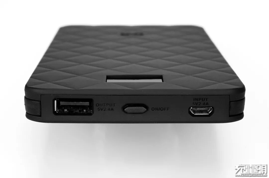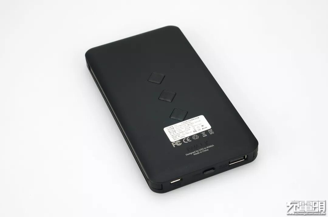 顶部插孔方面,带有一个常规Type-A输出孔,中间是开机电量激活按钮,右边是MicroUSB输入孔。也就是说除了自带的MicroUSB与Lightning输出短线外,还带有一个Type-A输出孔,一共3个输出。
