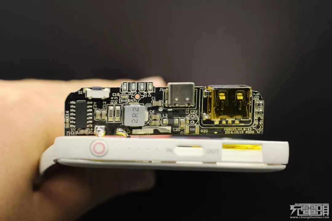 ▼背面看起来就复杂了许多,上面四个蓝色的LED,右边一个Type-C输入和USB母座,最左边有一个14脚的芯片,但是丝印被打磨掉了,中间有一个硕大的电感,PCB整体做工还可以,按键反馈清晰,充电、放电都不热。