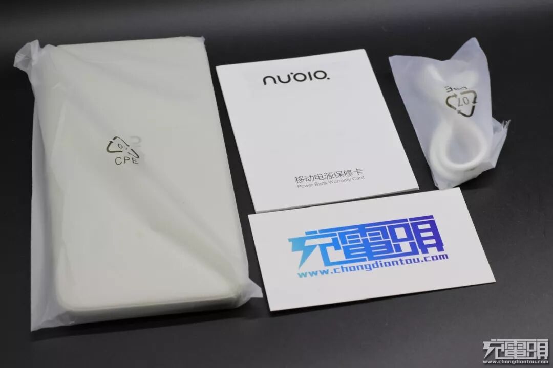 ▼全部拿出来,套着磨砂塑料袋的移动电源、说明书、Type-c接口的短线。