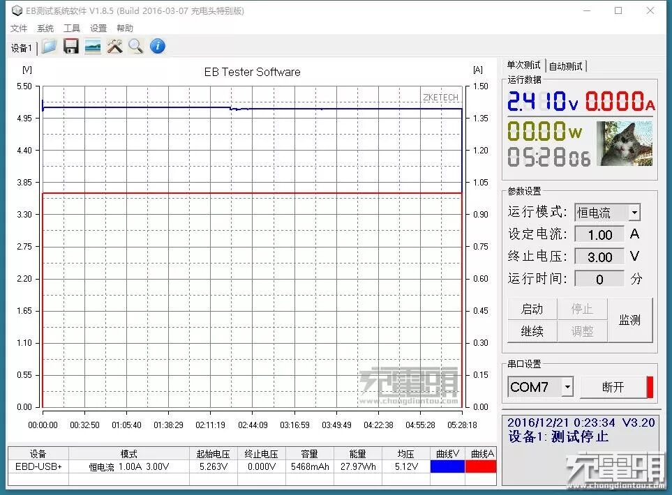 ▼5V 1A放电(类似于实际充iphone 6/6S等苹果设备),放出27.97Wh,转换率高达94.49%,均压5.12V。
