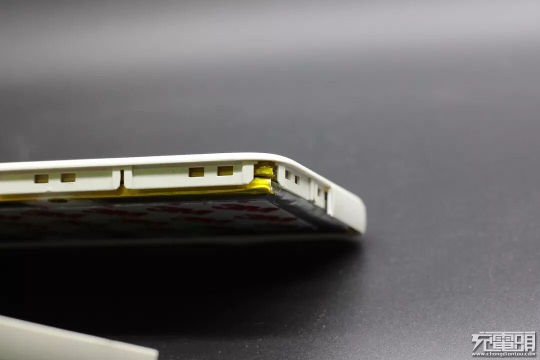 ▼侧面看是两块锂聚合物电池电芯,一上一下堆叠放置,中间和底部都有双面胶,很难撕开。
