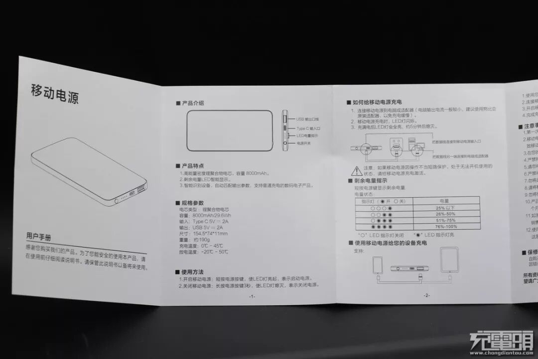 ▼说明书介绍了移动电源的参数和使用方法。