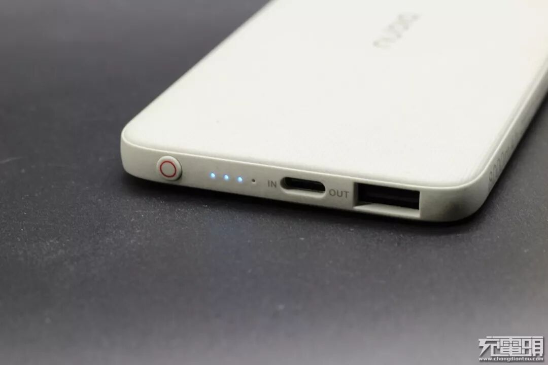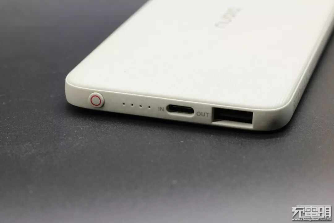 ▼最左边是努比亚标志的红色小圆圈,然后是四个LED电量指示灯,Type-c接口的输入和USB输出接口。