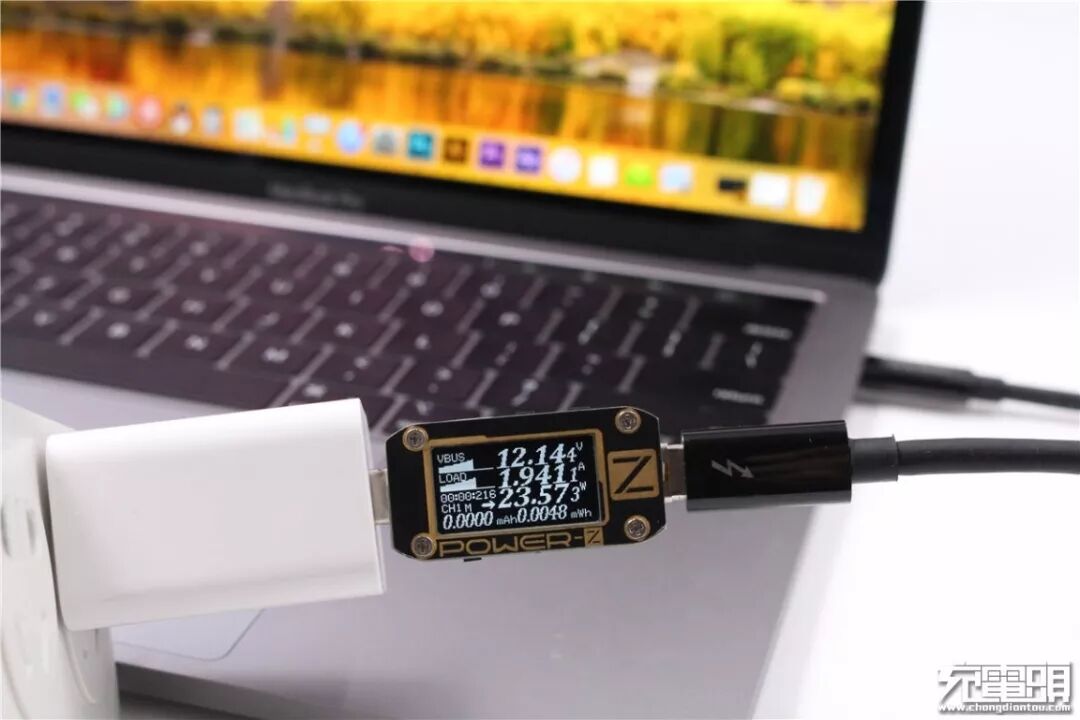 在给MacBook Pro 2018(13寸)充电时,显示电压12.14V,电流1.94A,功率约为23.57W,支持USB PD快充。