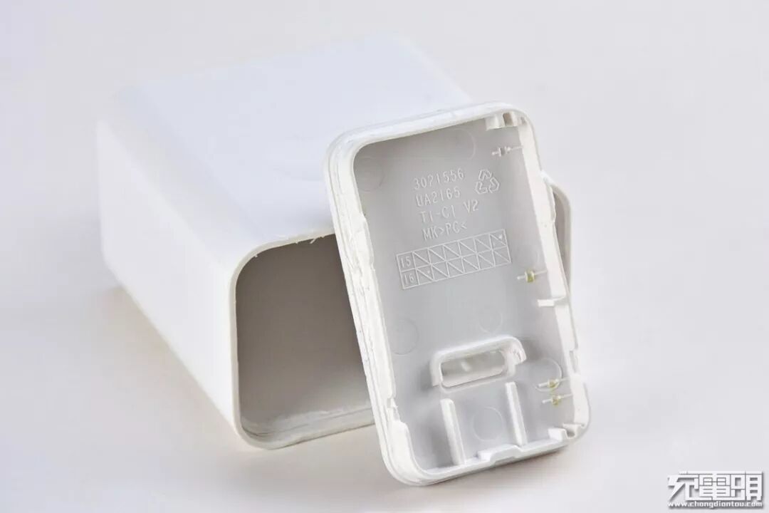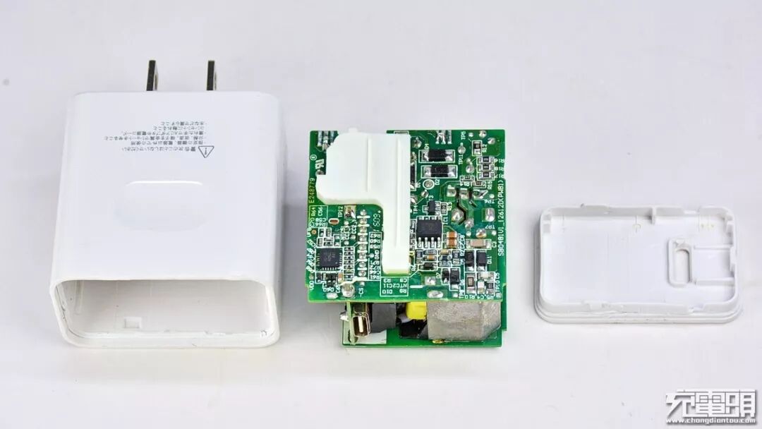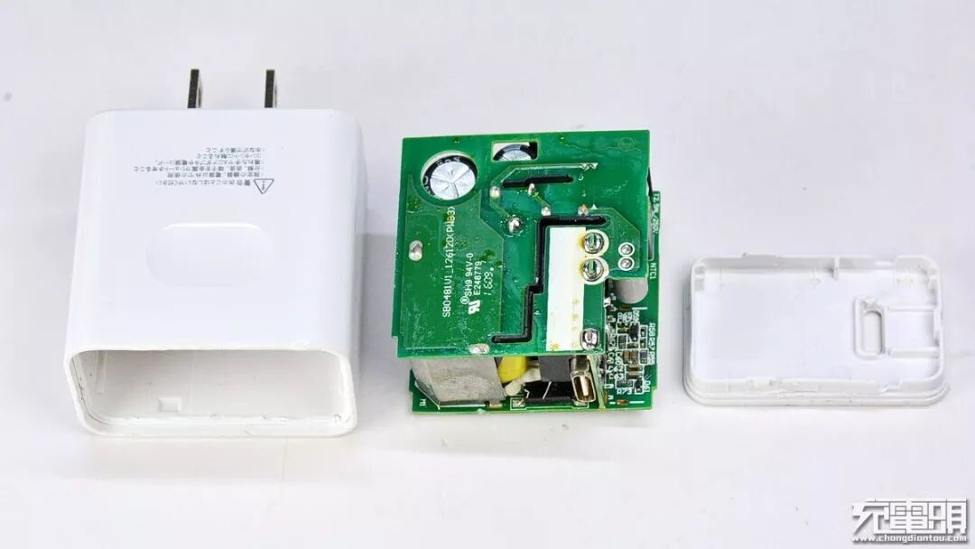 三、充电器拆解从充电器输出端面板撬开外壳,可以看到充电器内部的PCBA模块,采用的是两块PCB板结构。此前充电头网拆解的华为22.5W超级快充充电器、华为5V8A大电流超级快充充电器、航嘉27W QC4+快充充电器均采用的是两块PCB的结构。
