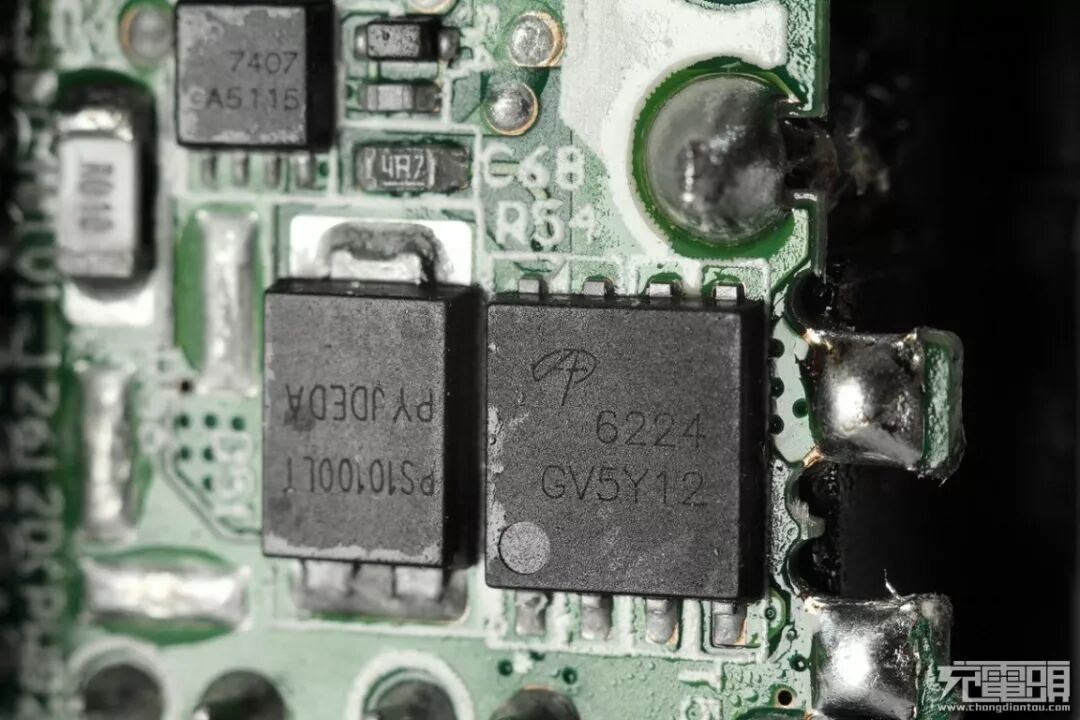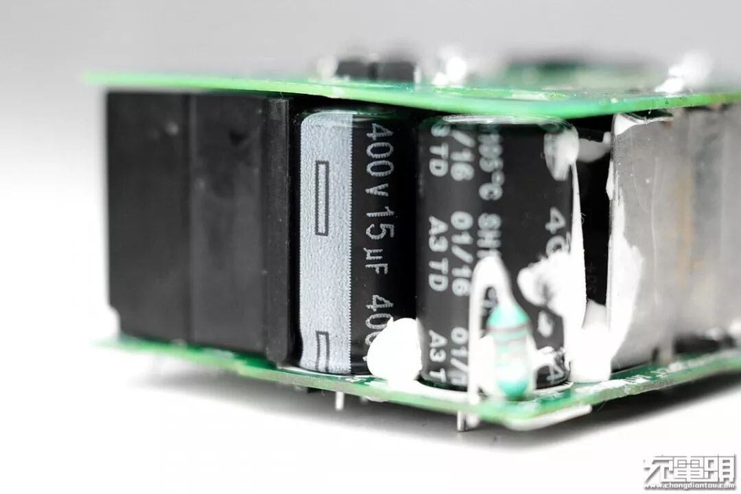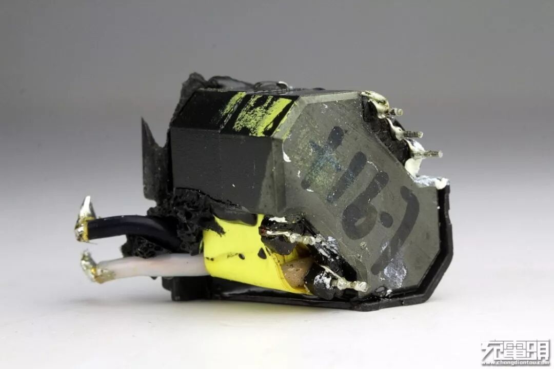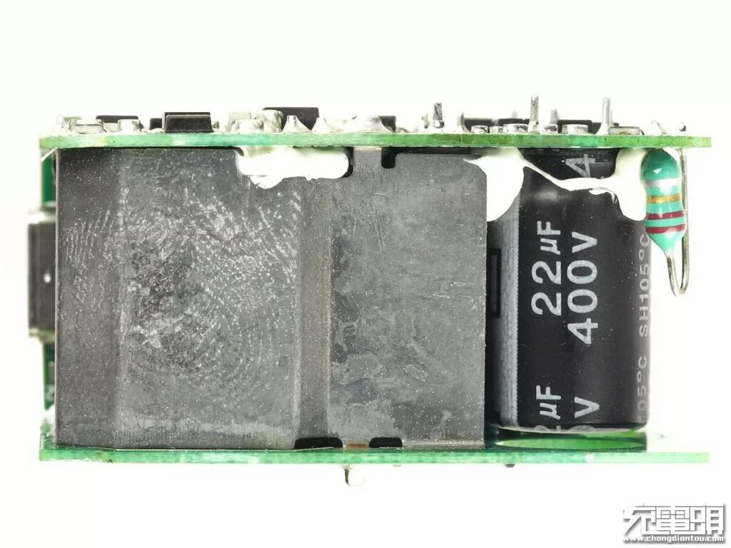 这一侧可以看到,整个充电器模块大面积采用了塑料绝缘处理,变压器的输出线直接焊接到输出小板上,进行同步整流输出。