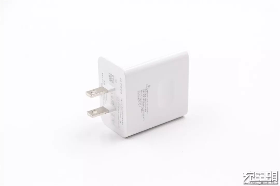 一、充电器外观白色外壳,表面烤漆工艺,外壳上有凹槽设计,延续华为充电器的风格。标配日规插脚,兼容国内标准,插脚不可折叠。