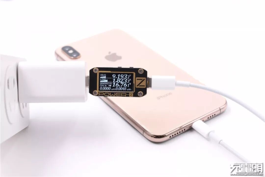 给支持iPhone XS Max充电,显示电压9.19V,电流1.82A,功率约为16.76W,支持USB PD快充。对于以上四款iPhone X,充电器均为9V高压快充模式。