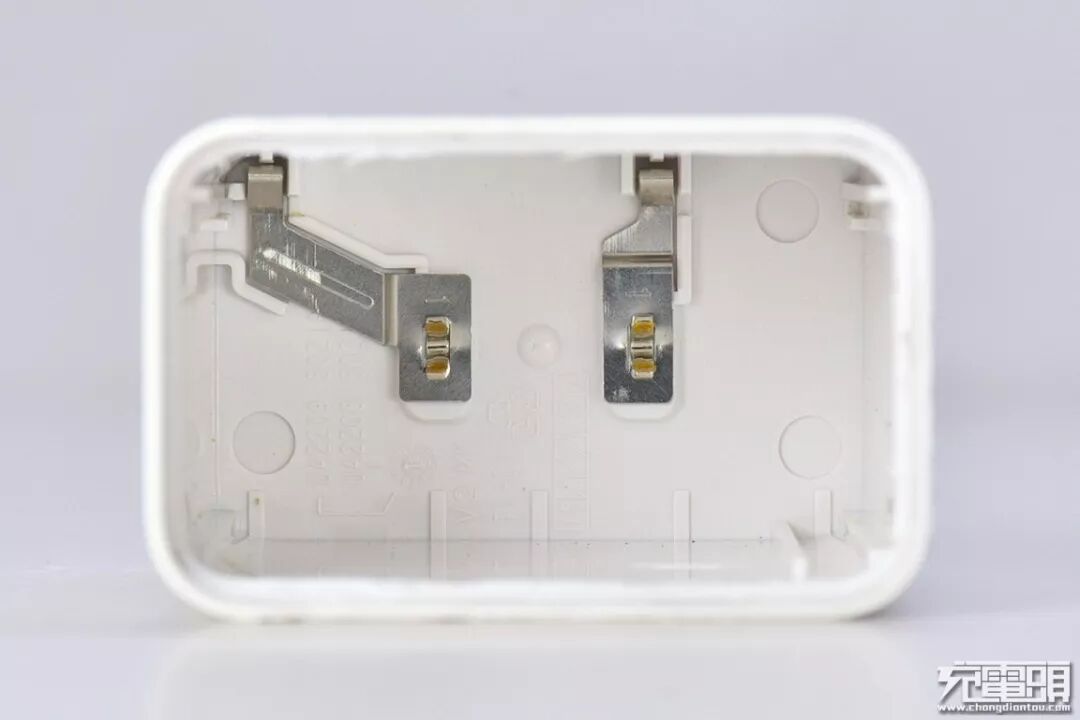 充电器外壳内侧,插头压接金属片接触到PCBA供电。