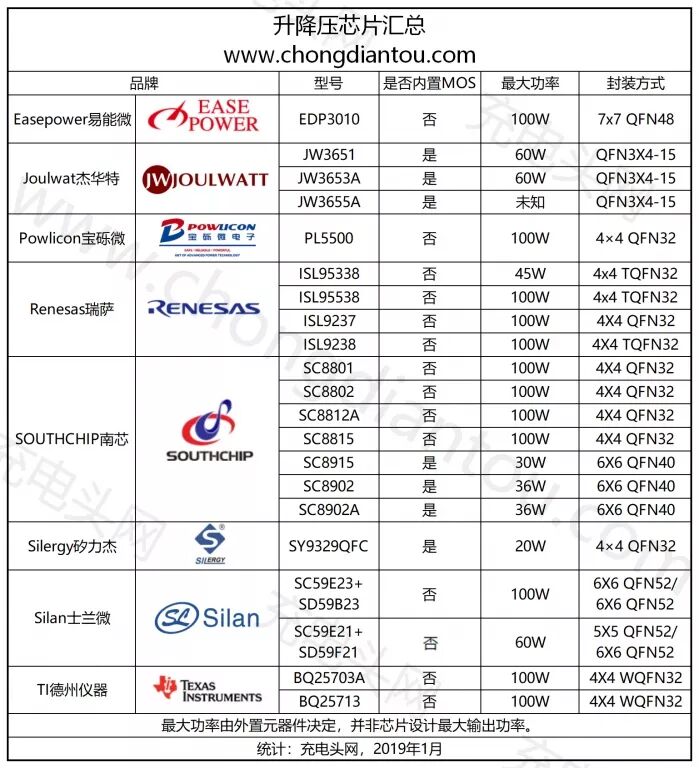 目前市面上的USB PD移动电源以采用高集成度单芯片方案的居多,虽然成本得到优化,但充电功率也只能维持在18W以内,很难满足笔记本电脑的充电需求。若想实现实现45W、60W甚至100W的充电功率,就必须将升降压和协议识别分成独立的两部分。对于大功率移动电源而言,其核心部分之一也就在于升降压芯片。 充电头网统计了目前市面上包括易能微、杰华特、宝砾微、瑞萨、南芯、矽力杰、士兰微、TI等在内的10家厂商,共计21款升降压(Buck-Boost)芯片。下面小编将对这些方案一一盘点,供大家选型参考。