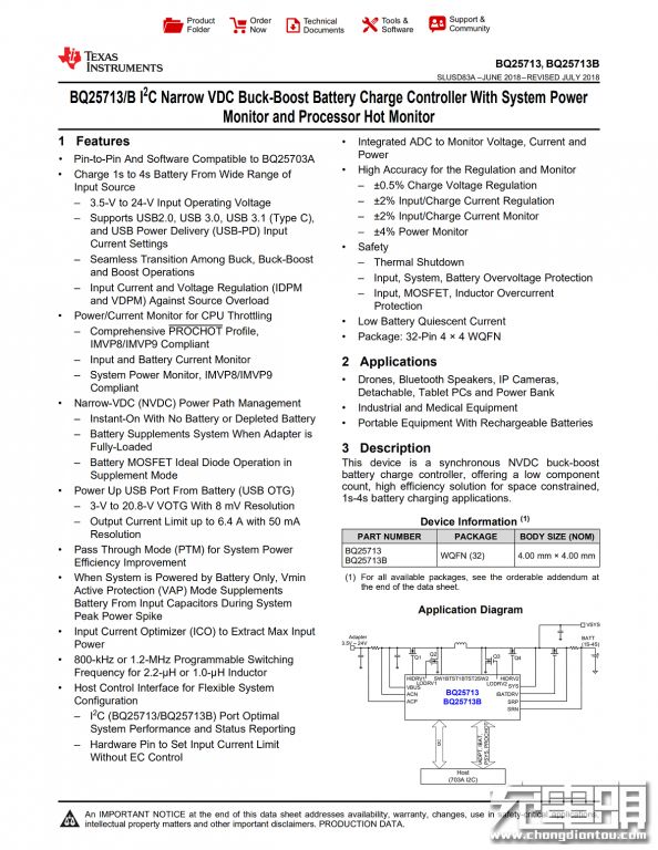 TI BQ25703具备输入/系统/电池组过压保护,MOS和电感过电流保护,以及过热关断。低电池静态电流,输入电流优化以获取最大输入功率,可对任包括锂离子、磷酸铁锂、镍镉、镍氢、铅酸等电池充电。