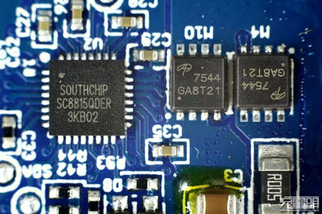 移动电源主控芯片,来自南芯半导体的SC8815,旁边是MOS管,共计4颗AON7544与南芯SC8815组成升降压电路进行输入输出。
