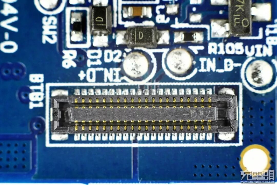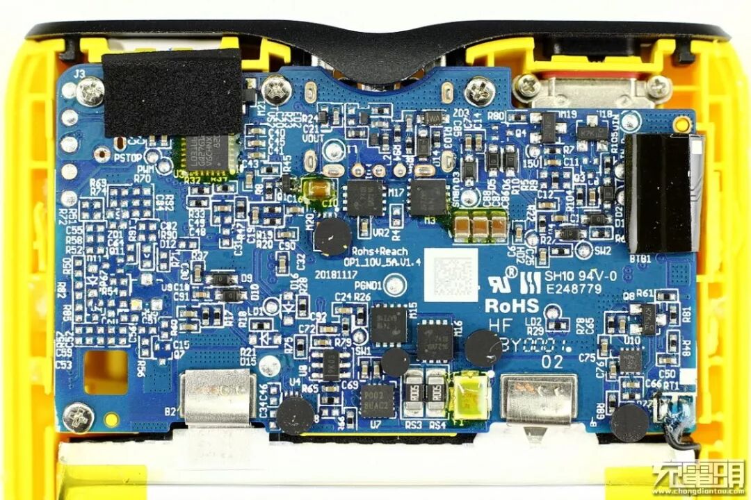 PCBA使用四颗螺钉固定在移动电源外壳上,蓝色板子上布满了元器件。电芯与PCBA之间为镍带连接。