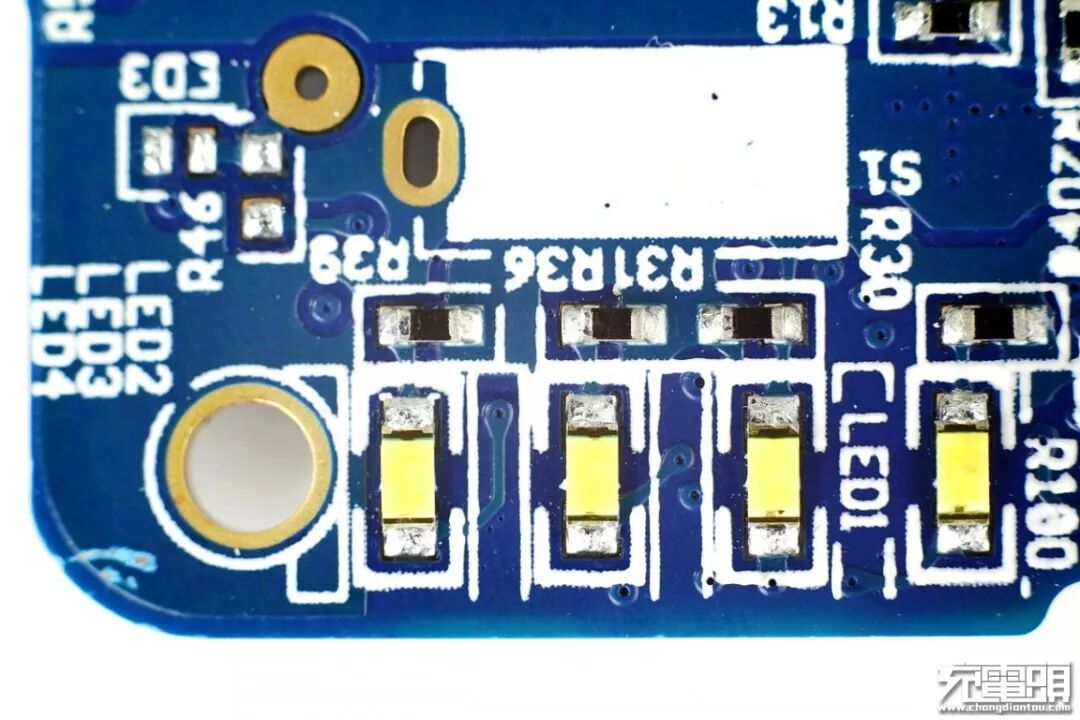 四颗LED电量指示灯,另外有一颗升降压控制芯片和两颗MOS管。