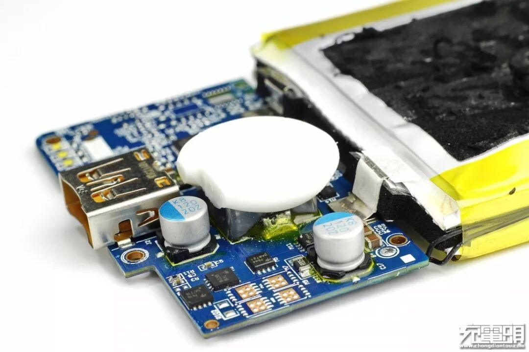 拆开移动电源外壳,露出里面的PCBA和电芯。由于最大输出功率可达50W,这款移动电源的PCBA尺寸较常规10000mAh的移动电源来说要大很多。