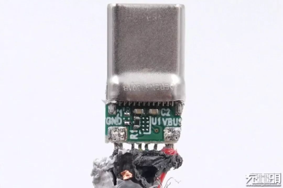 另一端接口的PCB板上有一颗E-Marker芯片,上面覆盖有一层蓝色保护胶。