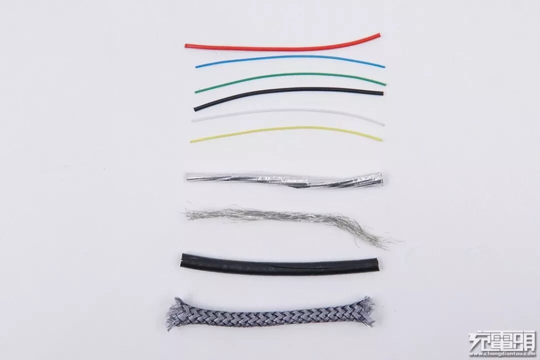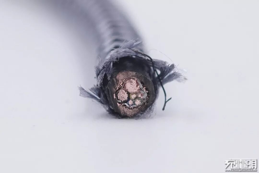 线材部分一览,从上到下分别是电力线芯、数据线芯、锡纸屏蔽层、金属屏蔽网、塑料外皮,编织外衣。