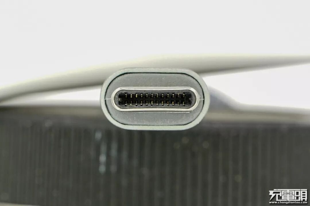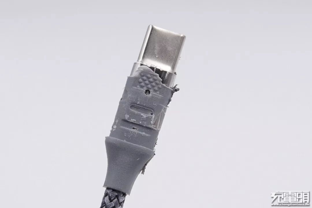 这端接口的绿色PCB板上有两颗电容和一颗电阻。线芯使用硬封胶固定。PCB板与USB-C接口连接处是12根整齐排列焊接的焊脚。