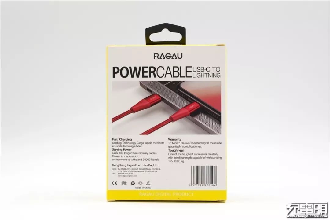 RAGAU USB-C to Lightning数据线采用纸盒+塑料托盘包装,纸盒上有塑料挂钩,便于线下展示。外包装为黄黑白配色,简洁时尚,包装正面印制产品实物图,并且带VU覆膜,摸起来有立体感。右上角非常显眼的标识质保18个月,此外包装盒上印有数据线一些特点:线长1.2m、通过了30000次弯折测试、能够支持PD快充。