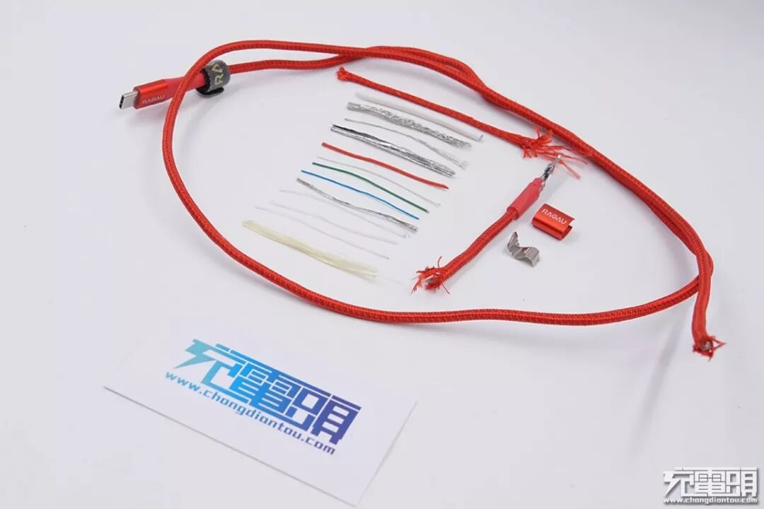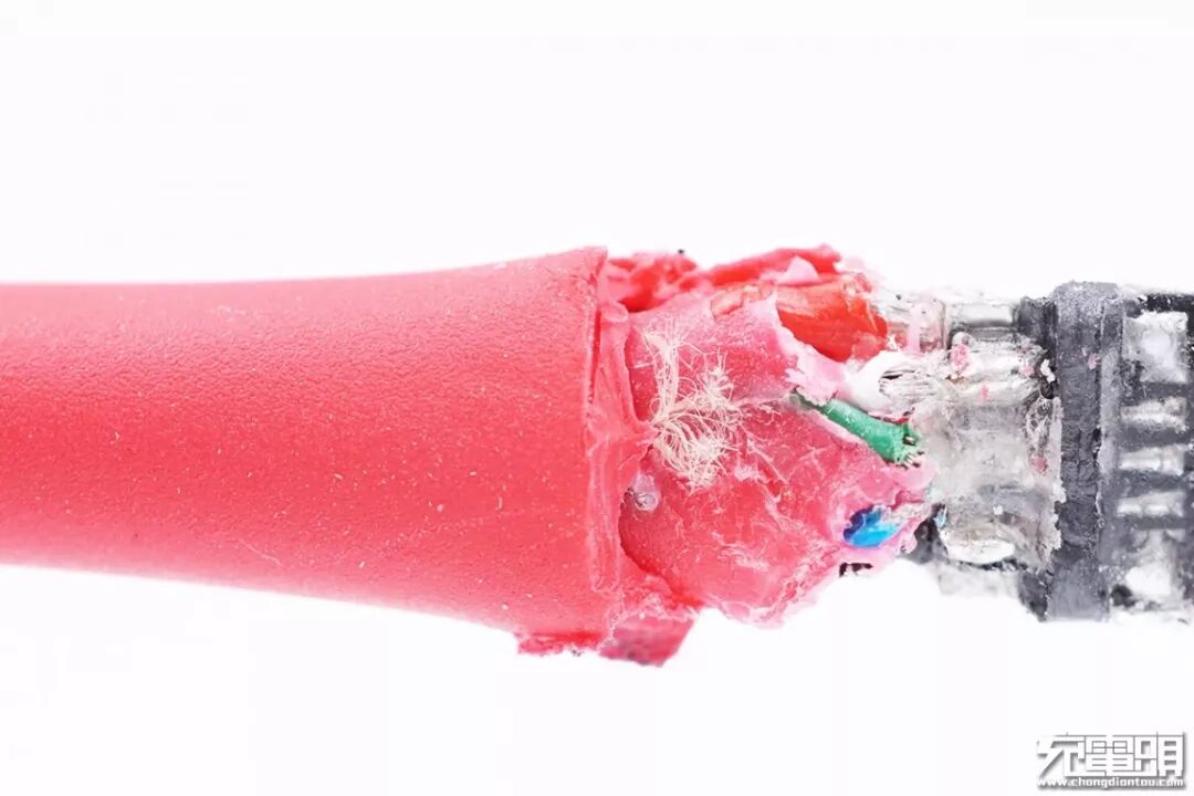 红色线芯为电流VBUS,20AWG粗,这样可以达到更低的阻值。此外红色线芯是五根线芯中最粗的,线芯里面不仅有铜箔螺旋缠绕尼龙细丝形成的抗拉线,而且还有凯夫拉线。