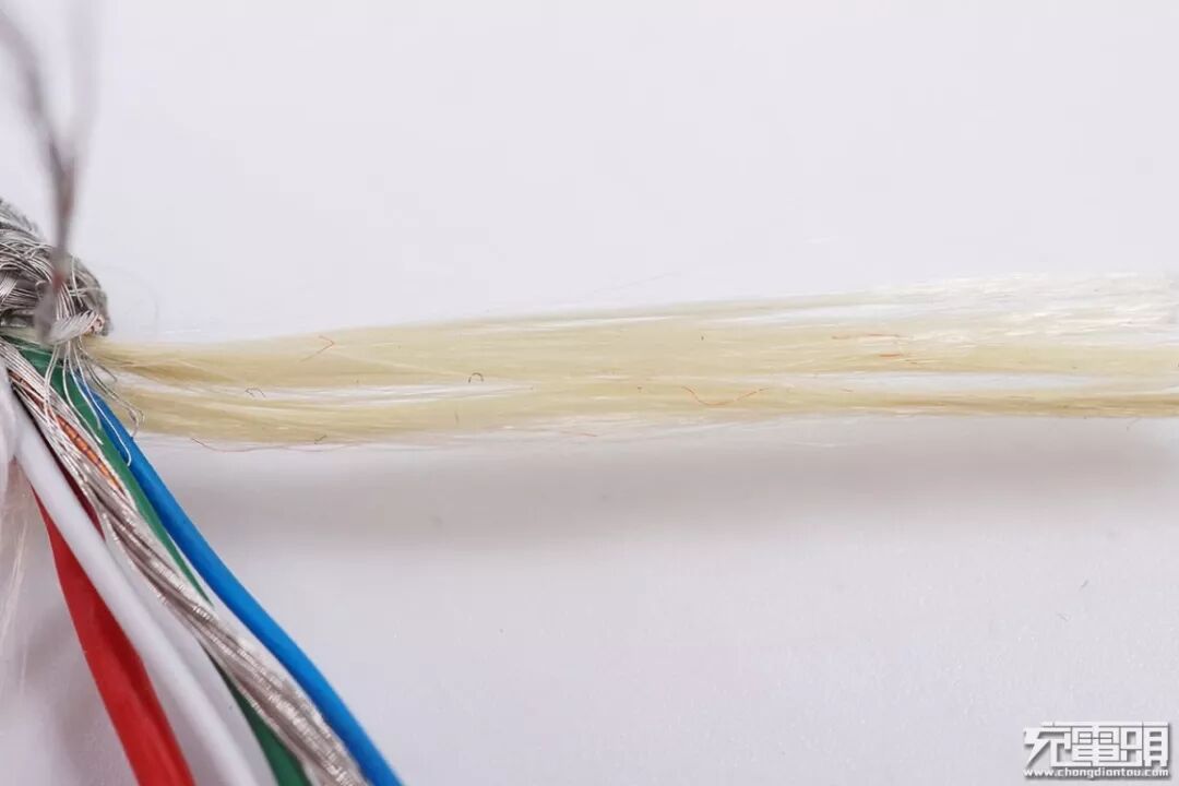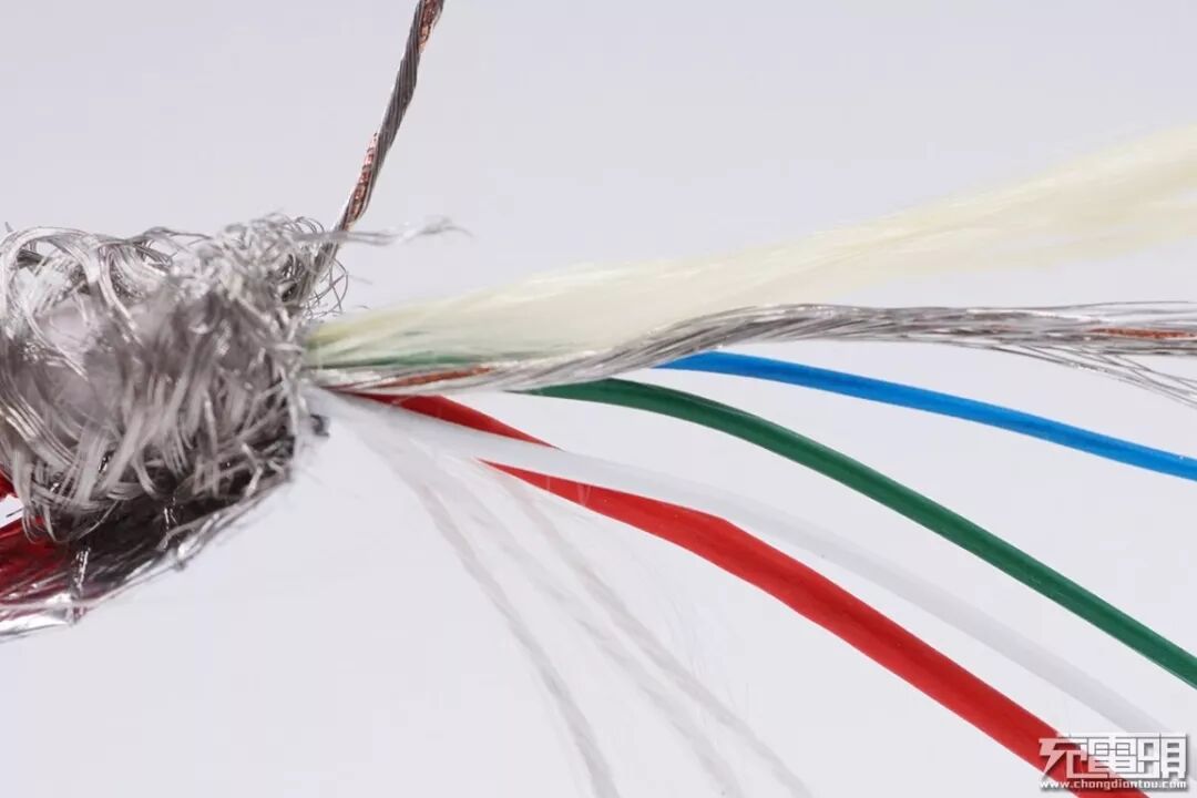 线材部分一览,从上到下分别是编织外衣、TPE外皮、金属屏蔽网、抗摇摆弯折线、铝箔复合屏蔽层、电力和数据线芯、三根棉线、凯夫拉线。