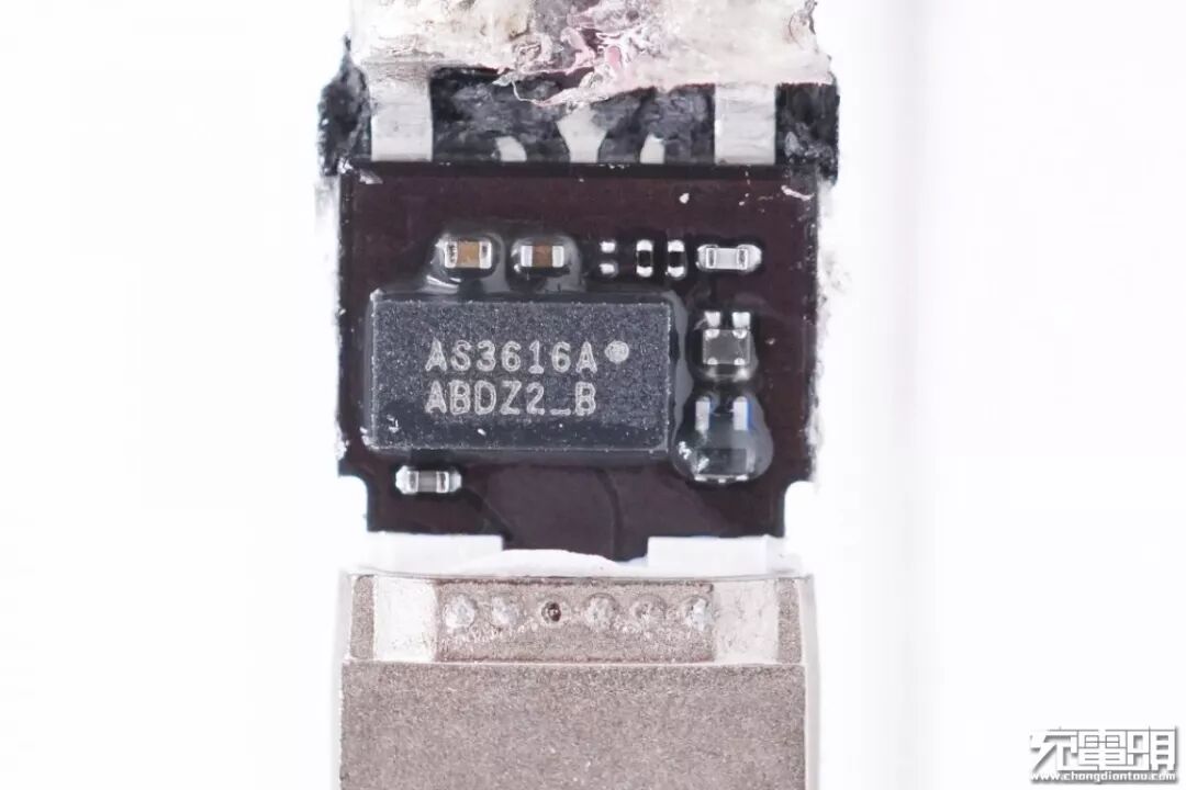 去掉硬封胶后,可以看到PCB板正面上有一颗大芯片,这是苹果C94端子芯片。相对于以往USB-A接口上面使用多颗元器件组合C48、E75端子芯片、USB-C接口的C91,C94芯片设计集成度更高并且可以支持USB PD快速充电。