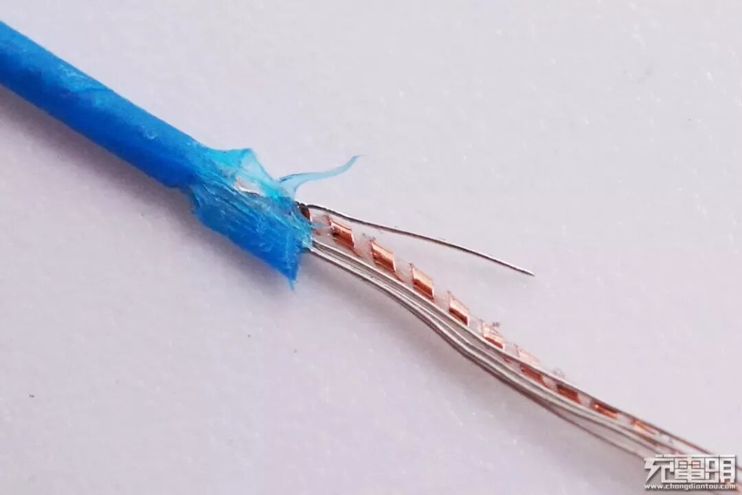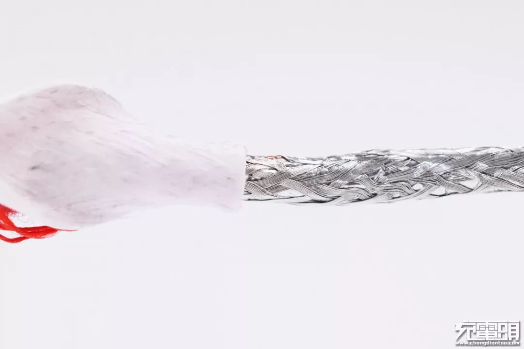 白色外皮内部是屏蔽网,具有屏蔽保护与稳固编织网层的作用,外皮与金属编织网结合十分紧密,外皮底部能看到外皮对金属编织网塑型挤压出的印记。