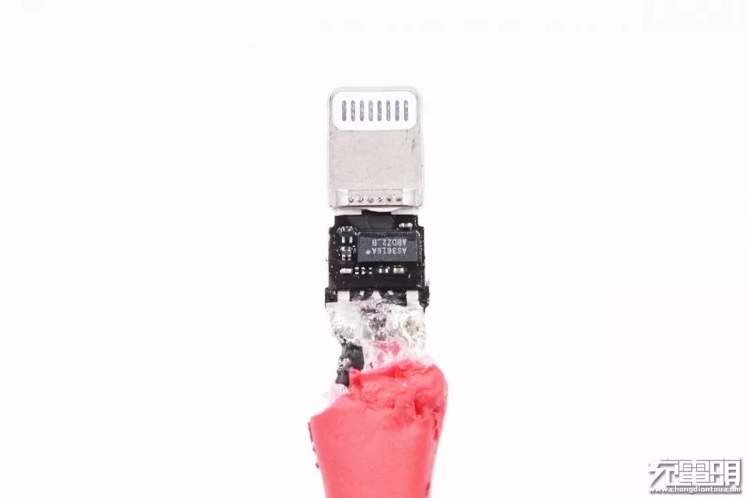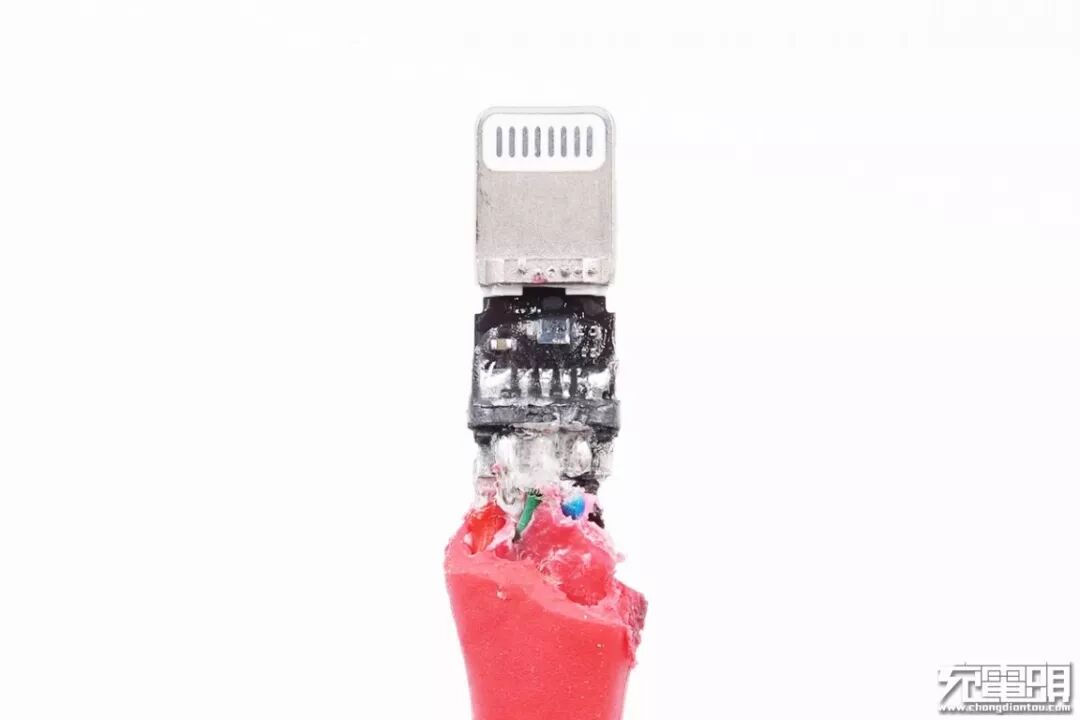 切开封胶,前端是Lightning头的金属外壳进行点焊固定,中间PCB板并使用一层硬封胶牢牢包裹着,末端还有一块延长片用来焊接线芯。