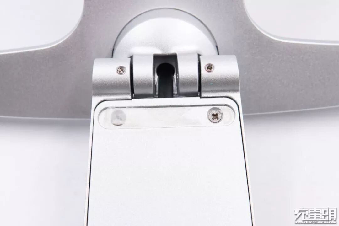 支撑板与三角架连接旋转轴处特写,可调节高度,自由旋转,堪比显示器支架。转轴两端使用黑色胶盖掩盖螺丝进行装饰。