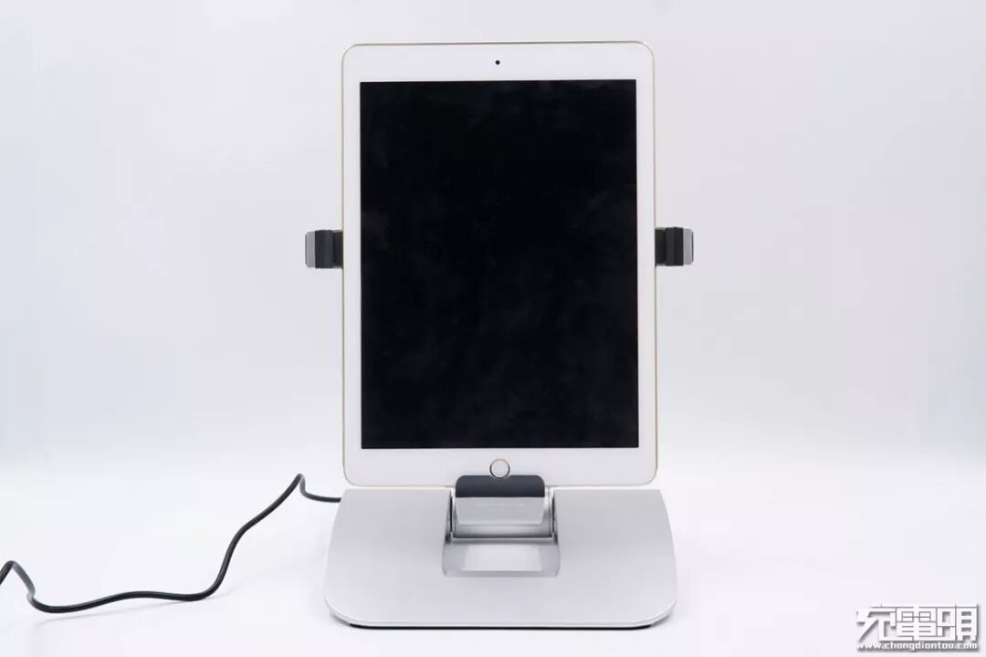 支撑脚软胶为内凹设计,帮助固定iPad,防止掉落摔坏,并且还有一个为iPad充电的Lightning插头。