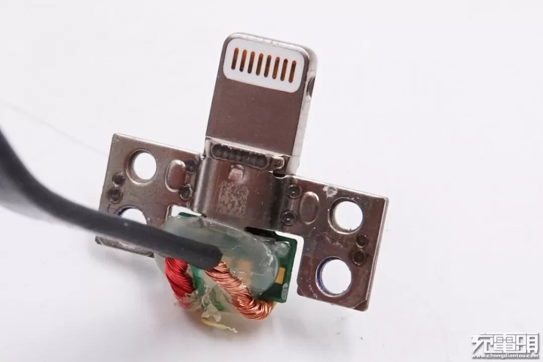 Lightning端子使用金属外壳点焊固定,PCB板上的焊点涂胶保护。