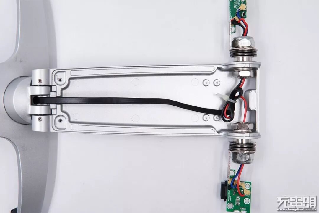 PCB板上也有两颗小螺丝,底盘外部的那两颗螺丝顺带用来固定PCB板。中间的支撑板与底盘之间使用空心带螺母的螺丝连接。