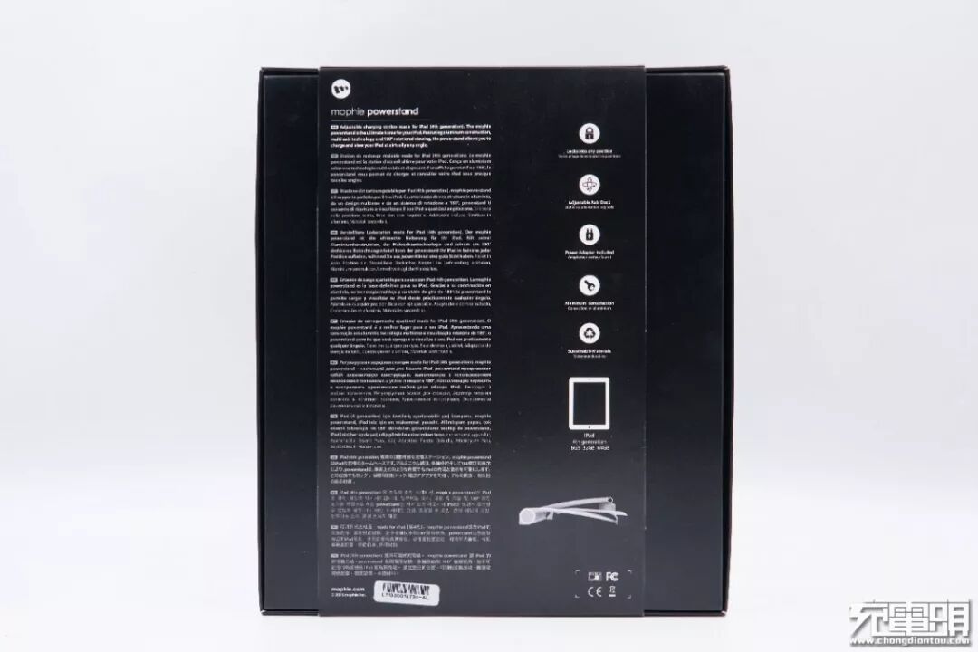 这款产品采用主体黑色的外包装盒,且包装盒中间套有一圈纸带,纸带上印有powerstand的正面使用图。包装盒两个对角端分别是mophie 的logo和“made for iPad”字样,左侧则是“mophie powerstand”产品名称。