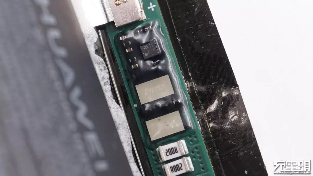 电池保护板上有三美电池保护IC和两个松下Panasonic的电池保护管,下方是检流电阻。