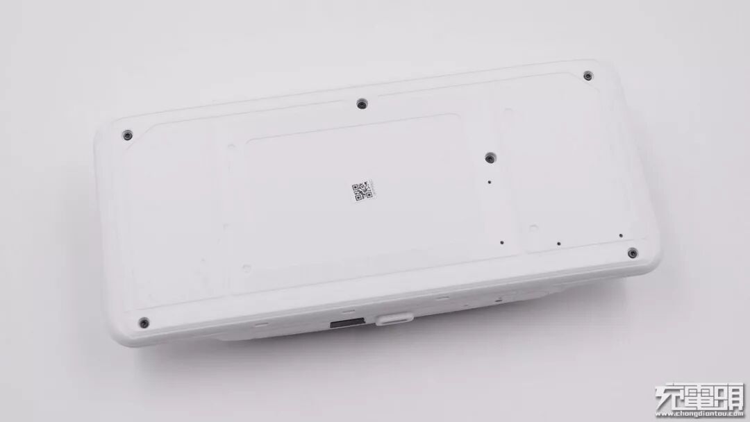 充电仓背部特写,有六颗固定螺丝,中间为二维码信息。