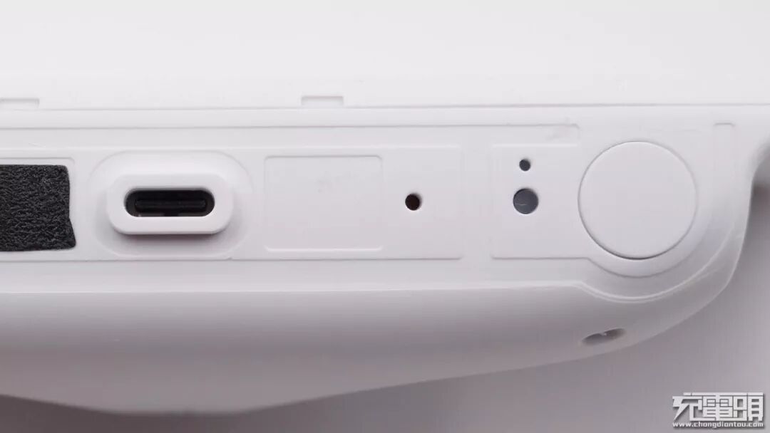充电仓底部特写,从左至右依次为Type-C接口、无功能性开孔、指示灯和多功能键。