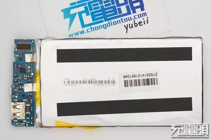 电池组特写,ZMI PB810使用了ATL出品的18.28Wh电芯(与小米5000mAh电芯不同),两块并联合成36.56Wh,实际毫安容量未标。