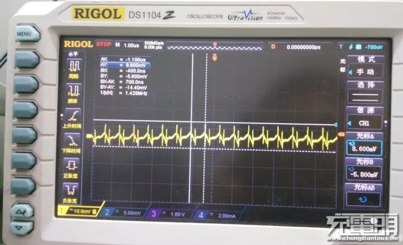 增加了一个输出纹波测试,ZMI PB810的输出纹波为14.4mV。对纹波没有概念的小伙伴们,可以参考国家通讯行业的YDT 1591-2009标准《移动通信终端电源适配器及充电数据接口技术要求和测试方法》,对于5V输出的适配器在0到额定输出电流的条件下输出纹波的峰峰值(Vp-p)应该≤200mV。