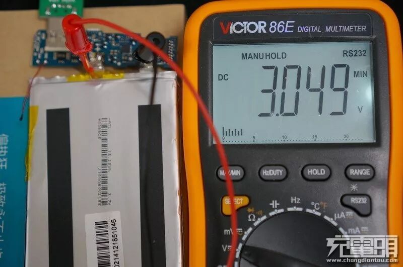 对充满电的移动电源以5V 1A放电,当最后一盏LED电量指示灯熄灭后,胜利86E万用表监测到的正负极电压为3.049V,比常规的2.75V略高。