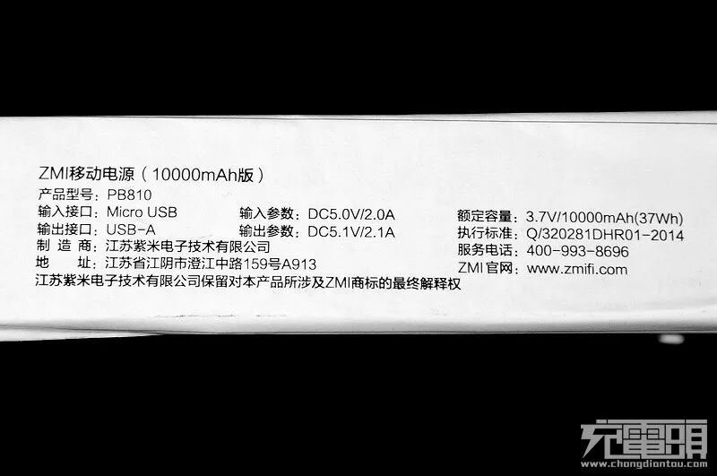 紫米型号为PB810的10000mAh移动电源外包装上印刷有详细的产品信息,不用打开包装盒就能了解到额定容量、输入参数、输出参数、紫米公司地址、官网,以及服务电话。
